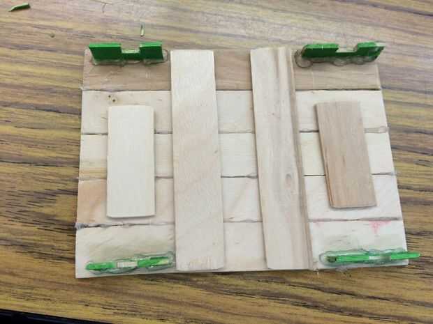 Luego, tome un palito y serrar palitos más pequeños de 4 x 1,5". Después de eso, vi a un pequeño hueco en el centro de cada una de las cuatro piezas, lo suficientemente grandes para colocar el eje en el espacio. Luego, pegar los trozos más pequeños en cada esquina del lado donde están los refuerzos. Pegamento paralelo a la dirección de los seis originales palillos como se muestra en la imagen.