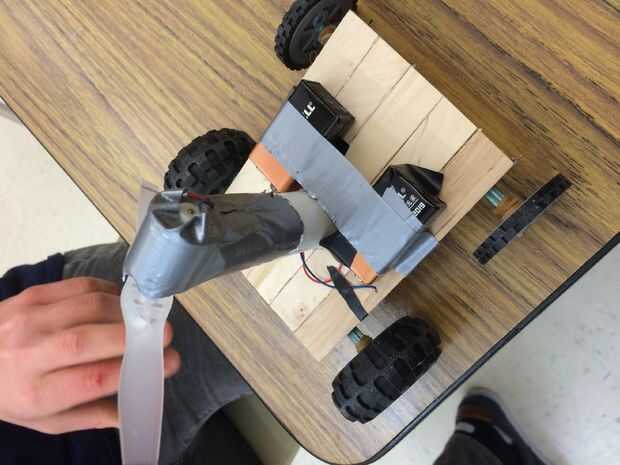 Por último, cinta dos pilas hacia abajo en la madera cerca del ventilador. Usted sólo estará utilizando una de las baterías, así que cinta los cables hasta la madera, cerca de una de las baterías, con la cinta eléctrica como se muestra en la imagen.