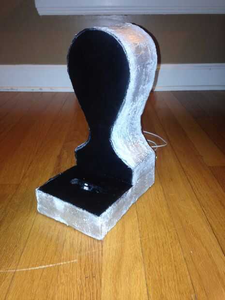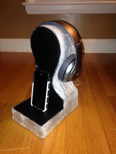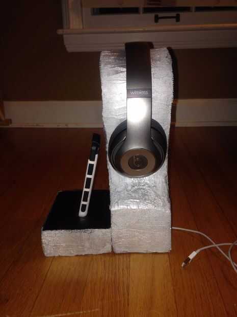 Decidió hacer un soporte de auriculares y el iPhone dock en uno y por un tiempo no podía decidir sobre un material para que sea de. Entonces pensé en cartón, y me pareció una idea interesante. Surgió con un diseño para poner el dock en la parte delantera del soporte del auricular mientras no afectando cómo descansan los auriculares en el stand.