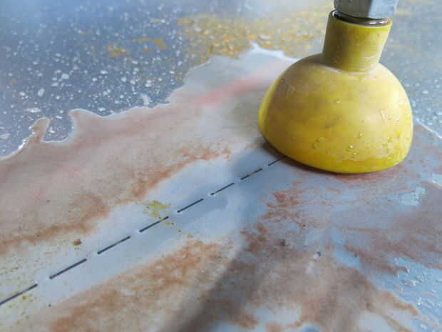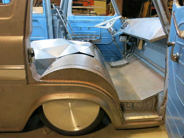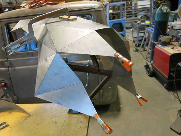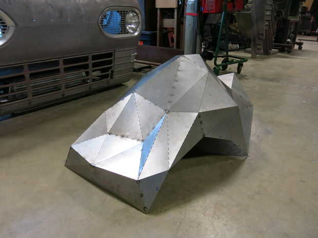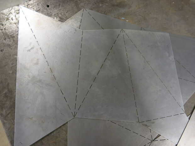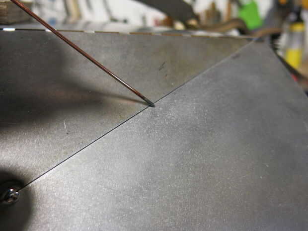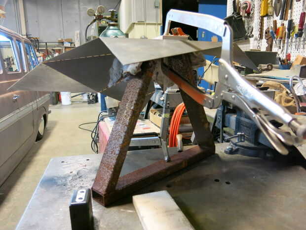 Corté el recinto motor de una hoja de 4' x 10' de calibre 18 frío laminados de acero. (Considerado el uso de acero inoxidable como más tarde no necesitaría pintura, pero he decidido contra él porque inoxidable puede fácilmente deformar y pasar con el calor de la soldadura.) Una vez que se cortaron 6 tramos, yo limpiar el moho con una rápida una vez más con grano 220 en una lijadora orbital.