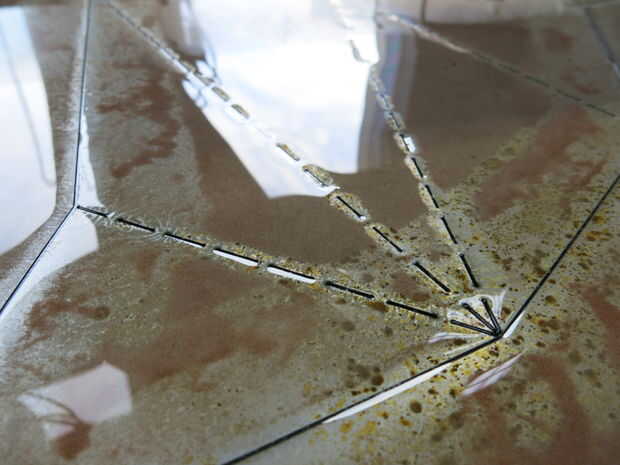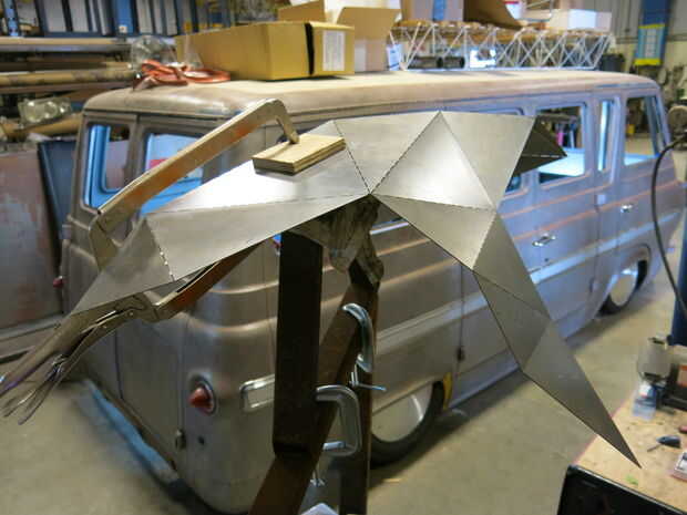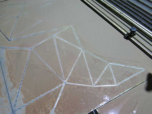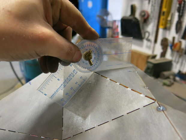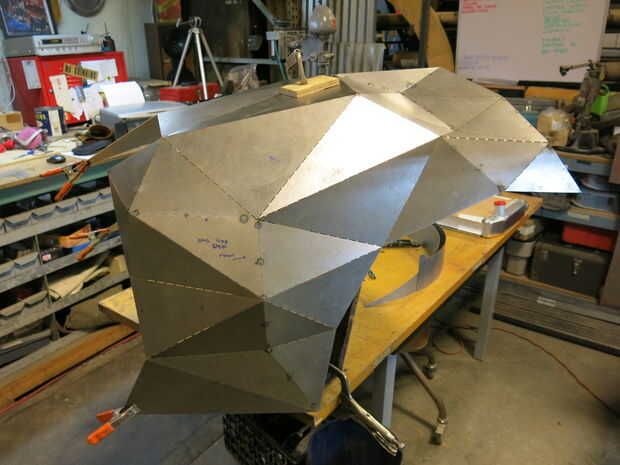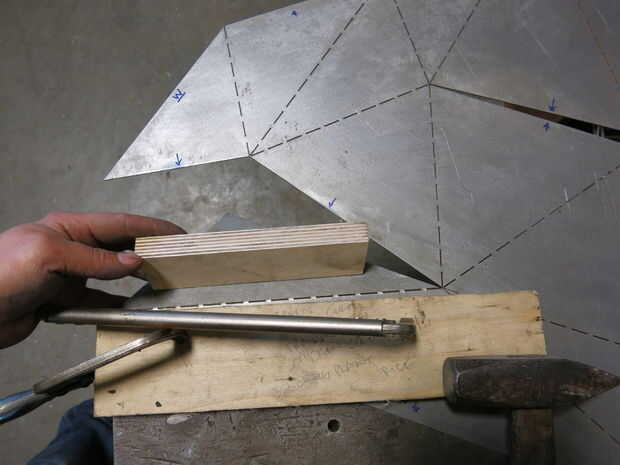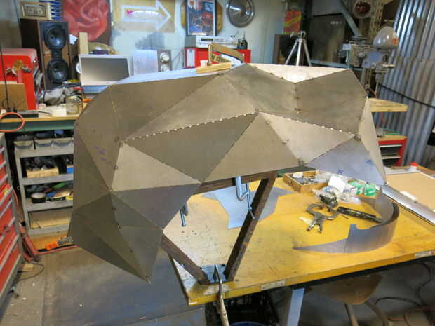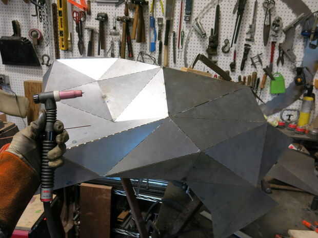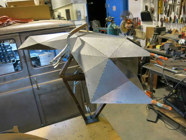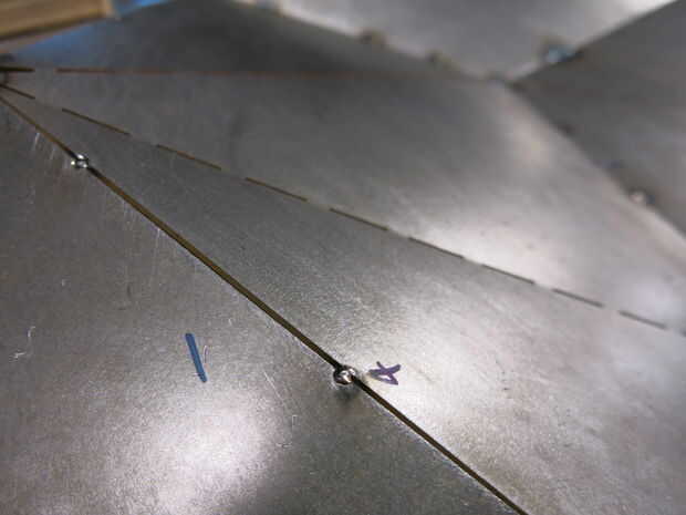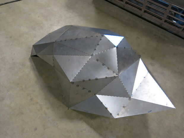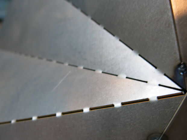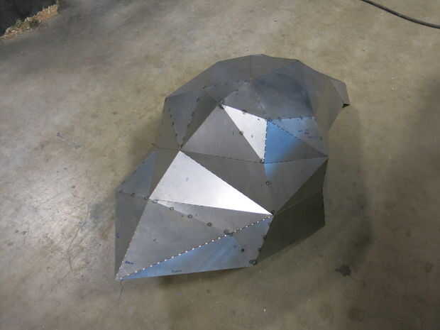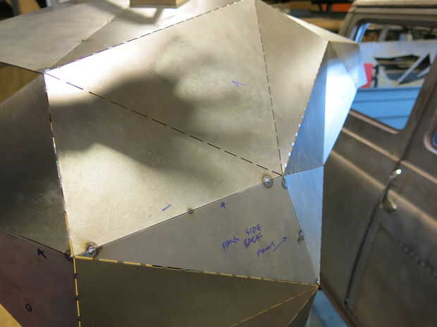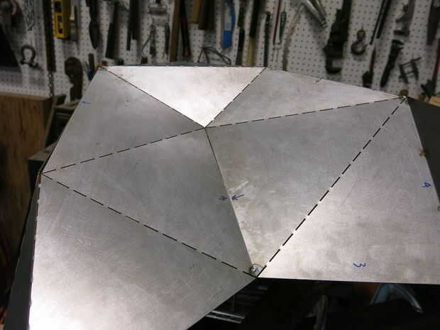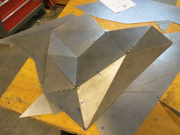 Entonces empecé a doblar con cuidado los paneles según las medidas de ángulo en mi archivo 3D. Fue un proceso bastante sencillo y satisfactorio, aunque me sorprendió cuánto variación de 1 grado puede alterar la forma como un todo. Una vez que una sección fue completa podría virar en lugar y pasar a la siguiente asegurando que fueron lo suficientemente apretadas como para no dejar la luz pasar a través de las costuras. Como la forma vino juntos podría empezar manipulando como un cuerpo entero.
