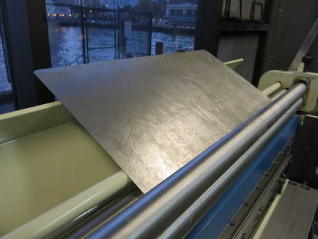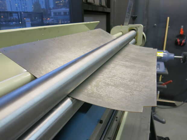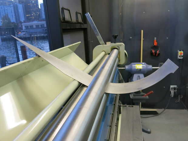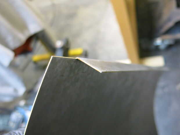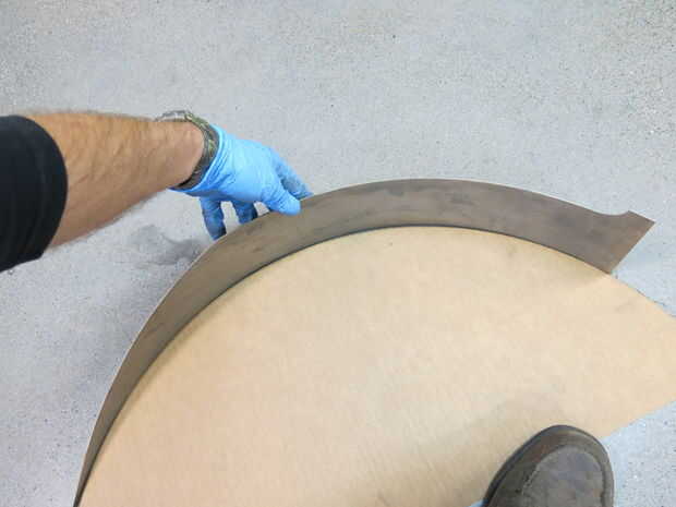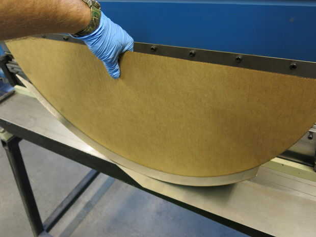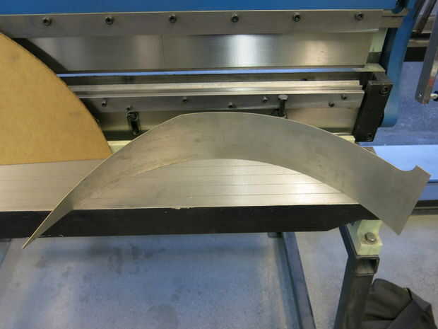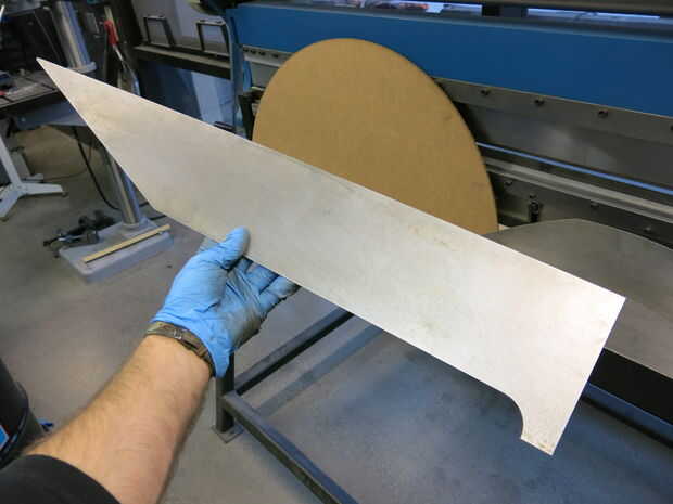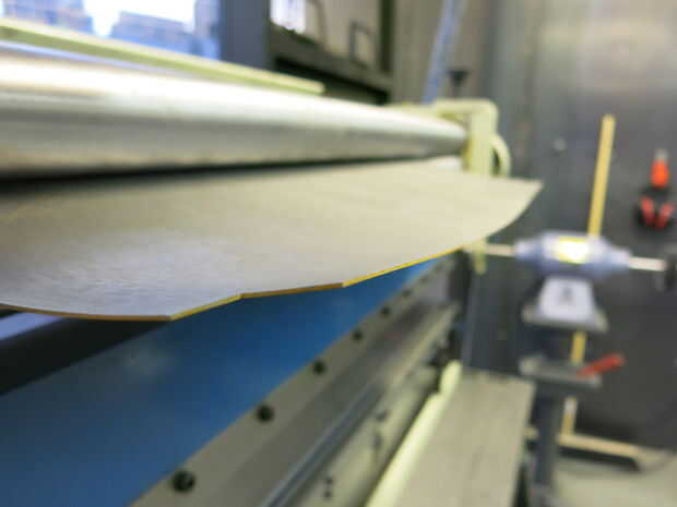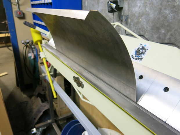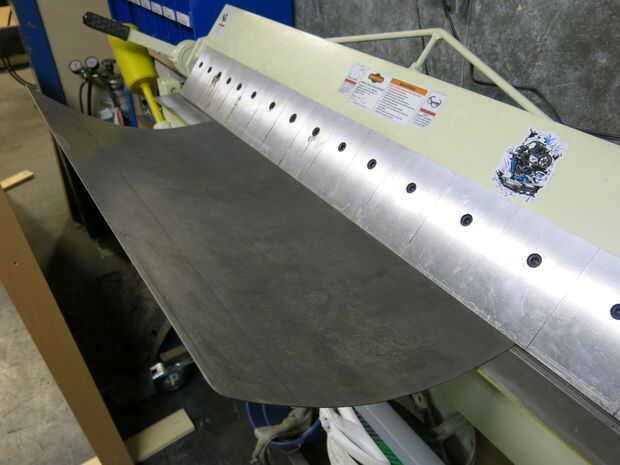 La parte delantera de la cabina de motor contiene el radiador, ventiladores y intercooler para la entrada del turbo. Quería que esta área sea sencillo y limpio buscando al mismo tiempo la función de flujo de aire de la tierra para arriba hacia el radiador. La solución más sencilla es seguir el radio definido por los arcos de rueda en un simple gesto. Para hacer estas piezas Corte mi patrón en el chorro de agua. Después de eliminar el moho con grano 220 envié el acero a través de los rodillos para obtener el arco derecha (primer intento!). A continuación dobló por bridas en un freno de metal de hoja, asegurándose de alinear los bordes agradables y apretados como este podría definir cómo la curva se encuentra con las defensas. Este panel se asegurará con el hardware me retire para acceder al radiador y la plomería en una fecha posterior que.