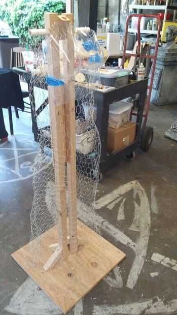 Una vez que el marco fue hecho empezamos a envolver marco de alambre de pollo para obtener la forma básica que queríamos para la viuda. (Fuimos un poco más pequeños en la forma que queríamos realmente, puesto que ella ganará algunos a granel una vez envuelto en tela). Desde allí había atado el cuerpo moldeado de un traje de baño de Costco en el pecho y corte hacia abajo para que calce.