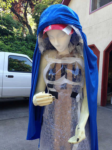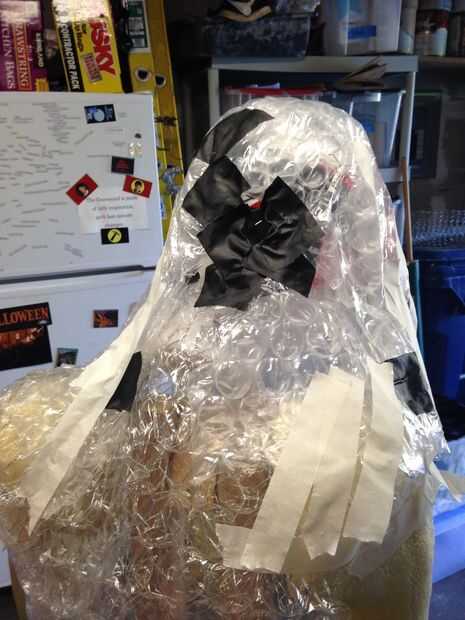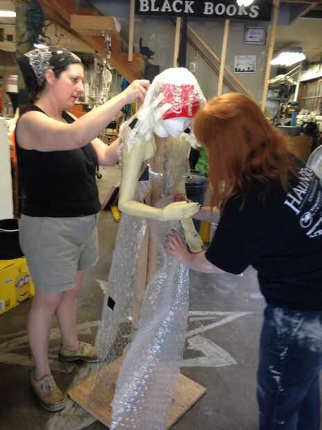 Se utilizó una cabeza de peluca estándar como la base de la viuda. Para capturar la mirada quería a modificado los labios y también cortar el cuello para captar un mejor ángulo una vez montado. Nos asegura la cabeza para el bloque de pivote, hasta tuvimos el ángulo correcto y luego atornillar el bloque en su lugar para mantenerlo seguro.