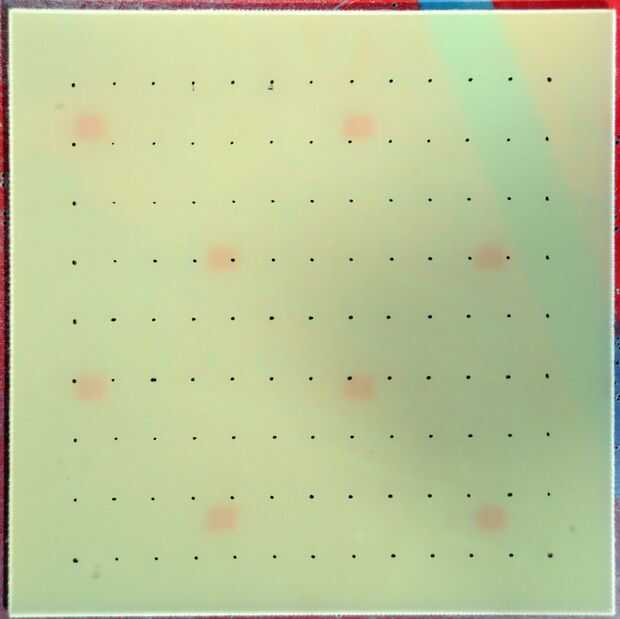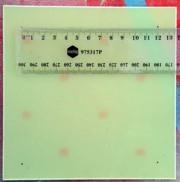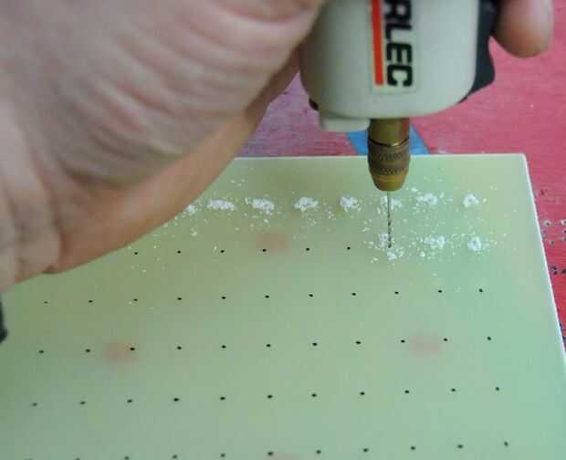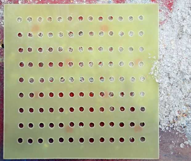 Empecé con un cuadrado de hoja de fibergless, sobre el cual me mide un cuadrado de 12cmx12cm. Que divide en una rejilla que era 13 puntos x 9 puntos (que resultaron con un espacio de 1 cm x 1.5 cm) y taladrar agujeros guía con una broca pequeña.