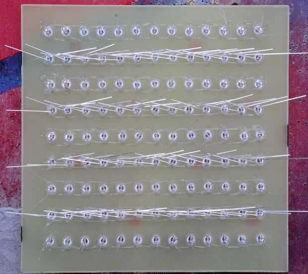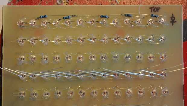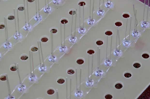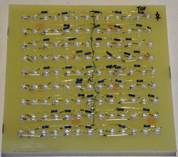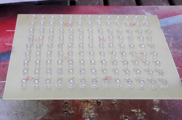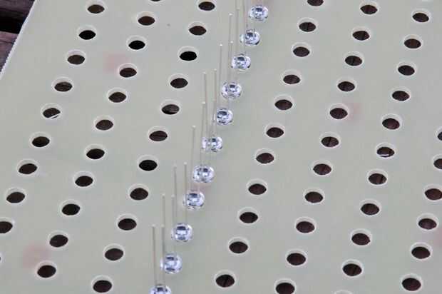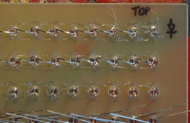 Una vez que se hizo, se deslizó cada uno en un agujero, teniendo cuidado de asegurarse de que estaban todas orientadas del mismo modo. Un chorrito de pegamento caliente del derretimiento fue útil en la realización de los leds en su lugar. Al montar, monta cada segunda fila en la Junta y plegar las puntas suavemente tiempo vinieron a montar los sistemas finales de filas.
