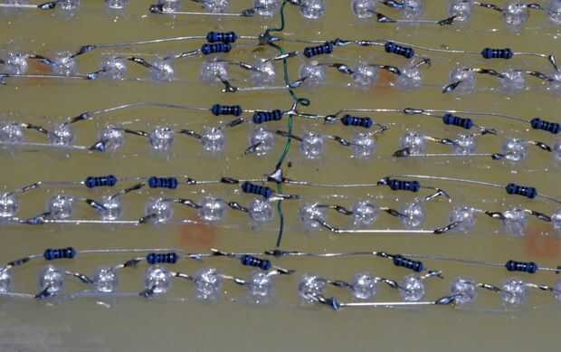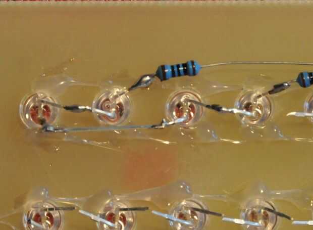 Luego recortar las puntas y soldadas en las actuales resistencias limitantes y soldar los LEDs juntos, siguiendo el esquema de trazado exactamente. Cuando usted está siguiendo el diagrama, recuerda que estás trabajando en la parte posterior de la Junta, por lo que necesitará invertir mentalmente el diseño. -No olvidar usar 36R resitors (véase abajo) cuando esté conectado a un sistema de 3 LEDs y 360R resistencias (véase abajo) cuando se conecta a un sistema de 2 - altera el flujo de corriente para los LEDs un brillo uniforme.