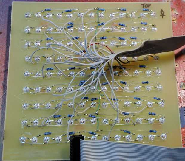 Decidí hacer la tablilla mediante un trozo de material de fibra de vidrio, con los LEDs montados en una serie de agujeros que agujeros. Se trata de un sistema de montaje diferente que la original, pero creo que es probablemente más accesible, ya que no depende de otro PCB caro. Los LEDs están soldados en la parte posterior de la Junta a un trozo de cable de cinta 26 manera que se termina con un conector IDC de 26 forma.