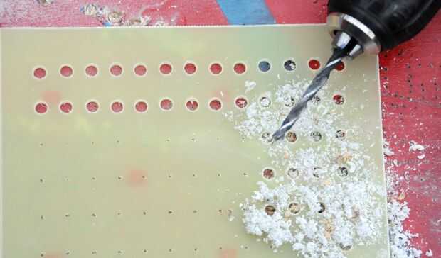 Luego medí los diodos y de hecho fueron 5mm de diámetro, así que perforé un montón de agujeros de 5mm... Antes de empezar la perforación, sabía que iba a ser un lío muy grande. Había material tablero por todas partes. Hice la perforación exterior y hecho que llevaba una máscara contra el polvo.