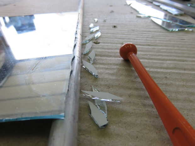 Esta parte era del nervio del tormento. Nunca tengo corte el vidrio. Yo sabía todo lo que tenía para material era el espejo que encontré en la basura de mi vecino una semana antes. Es curioso cómo si Lea tiene una mejor oportunidad de éxito. Me di cuenta de que colocando el vidrio en la cartulina había guardado de última hora en lugar mientras que en el concreto. Tener una varilla de freno el vidrio sobre también marcó una enorme diferencia. Corté el vidrio con la ayuda de una plaza. Me aseguré que cubrir la parte posterior con cinta aislante en caso de que el vidrio se ha roto.