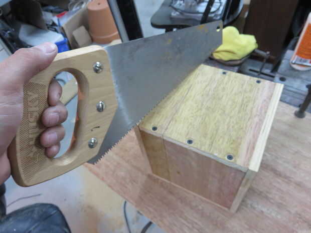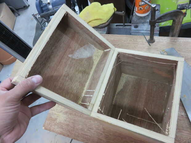 Por alguna razón esto me recordó a cortar una tapa en una calabaza. Primero marque una línea alrededor de la caja. Entonces facilitó cuidadosamente mi serrucho en una esquina de la caja. Con cada golpe me guía la hoja por lo que quedaría en la línea de lápiz. Una vez que llegué a la otra esquina, me gira la caja y repite el procedimiento. cortando la caja aparte como este aseguró la tapa alineada perfectamente.