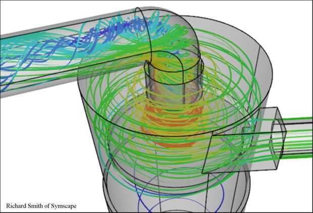 Yo también han agregado varios dibujos mostrando el flujo de aire a través de tubo liso y corrugado, así como alrededor de un codo de 90 grados. En un tubo liso, el flujo rápido de aire es por el centro de la tubería debido a la fricción contra las paredes crea fricción en el aire. Y ves cómo perturbado el flujo de aire en el separador ciclónico de dibujo.