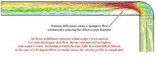 Un codo de 90 grados crea sus propios problemas. Como el aire es forzado a cambiar de dirección, crea un área de baja presión con eficacia reduciendo el diámetro de la tubería.