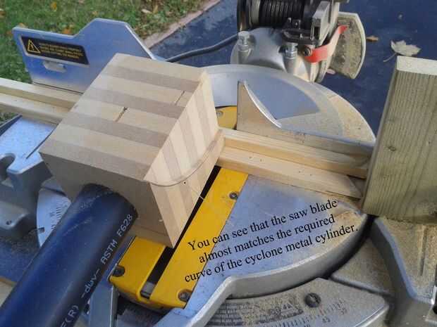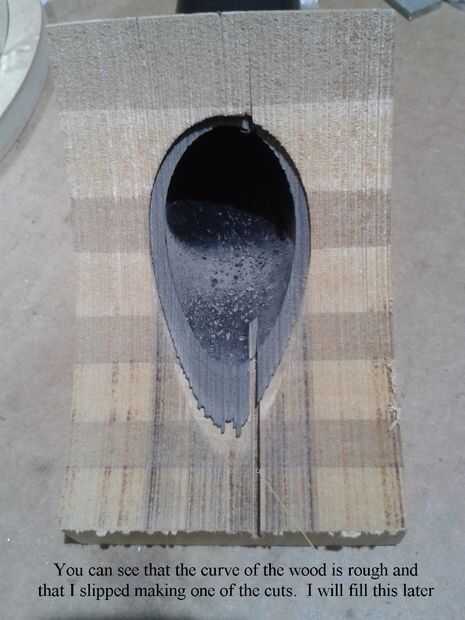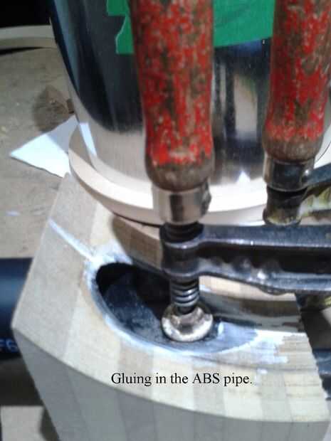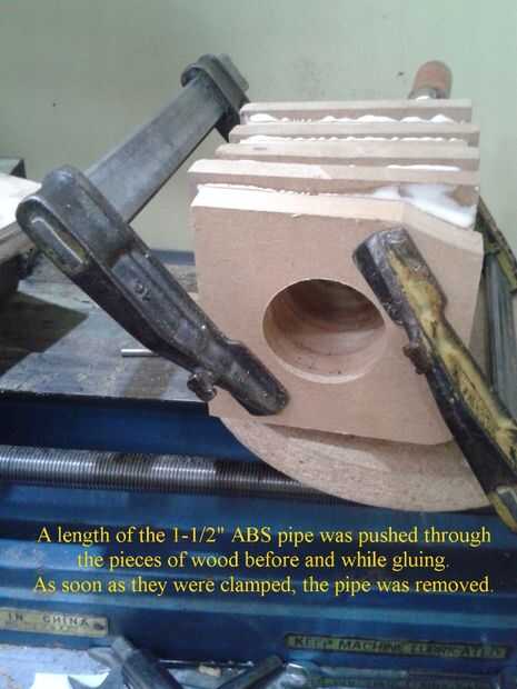 La ayuda de pipa 'entrada' se hizo de 8 piezas de MDF. Cada pieza era aburrido para el OD de la tubería ABS de 1-1/2 del centro. Cada pieza fue cubierta con el pegamento de madera de buena calidad y colocado en el tubo. Cuando todas las 8 piezas en el tubo y afianzado con abrazadera, el tubo fue hacia afuera (para evitar ser pegado a la madera). Al día siguiente, el bloque de madera se enfrentaron con mi sierra de corte eléctrico. La curvatura de la chapa fue dibujada en un lado del bloque y salió cerca de 10" de diámetro. Ya que mi hoja de Sierra de corte también es 10" diámetro, configurar dos piezas de madera en la sierra para cortar estrechamente a la curva. Esto se ilustra en las 2 fotos y te darás cuenta en este punto, el tubo ABS ha sido equipado por la prensa (no pegados) en el agujero y se corta junto con la madera. También sirve como asa durante el corte.