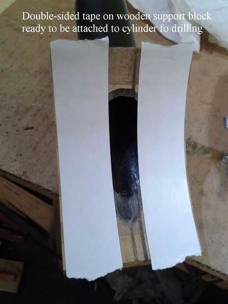 Ahora Aplique cinta doble cara en la parte curva del bloque de apoyo y coloque en el cilindro como antes. Una vez más, asegúrese de que la curvatura del tubo coincida con el agujero en el cilindro. Ahora usando la misma broca, taladre a través del orificio de montaje desde el interior del cilindro.