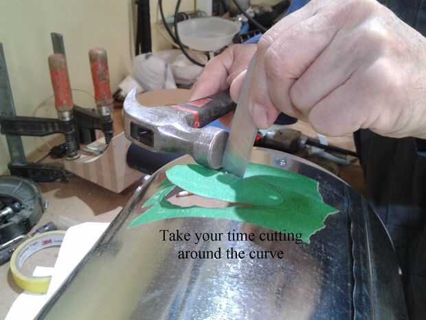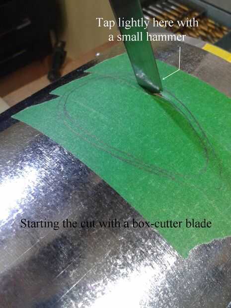 Ahora, yo he sido de corte metal de hoja fino con una cuchilla de caja durante muchos años, pero puede practicar primero en un pedazo de chatarra. Alternativamente, podría perforar algunos agujeros pequeños juntos y use una hoja de sierra mini para cortar la curva. Utilizando una sierra de calar puede distorsionar el metal y ser peligroso para su bienestar. Es relativamente fácil de perforar a través del metal delgado por la pala contra el metal y golpearlo ligeramente cerca del borde de corte con un pequeño martillo. Continuar el corte alrededor de la curva de mantener dentro de la línea.