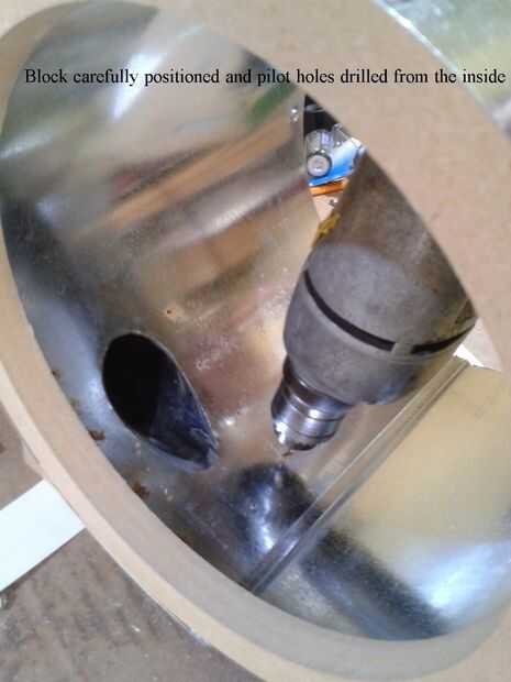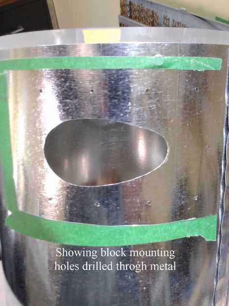Coloque correctamente el bloque de apoyo en el cilindro de metal asegurándose de que la curvatura del tubo coincida con el agujero en el cilindro. Marque el contorno del bloque en el cilindro. Ahora coloca cinta adhesiva contra la parte exterior del contorno y había marcado 6 lugares donde irá el bloque de tornillos de montaje. Estas marcas con una broca de tornillo raíz diámetro de taladro.