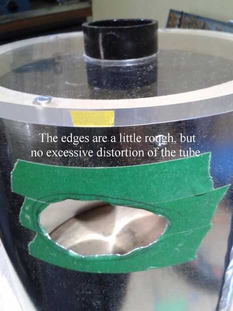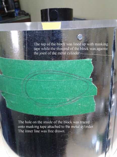 Una vez que la curvatura era correcta, cinta de enmascarar fue lugar en el cilindro de la distancia correcta de la parte superior del cilindro. El bloque fue colocado correctamente sobre el cilindro y el orificio de la tubería trazada en la cinta de enmascarar. Teniendo en cuenta el espesor de la pared del tubo, el contorno para cortar fue dibujado dentro de la línea trazada a mano.