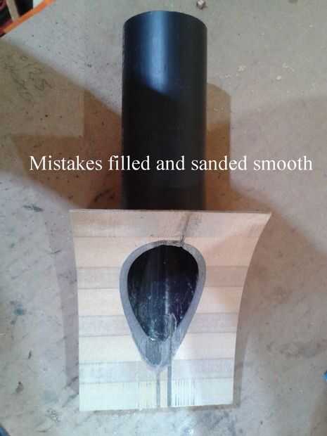 Ahora es necesario pegar el tubo en el bloque de soporte. Uso LePage 'pegamento resistente a la intemperie al aire libre' limpie un poco de pegamento en la parte exterior de la tubería hacia y entre la parte posterior de la corte curvado. También limpiar pegamento alrededor del tubo curvo corte en el bloque de soporte. Introduzca el extremo curvado de la tubería por el extremo cuadrado del bloque de soporte e introducir hasta la curva del tubo coincide con la curva del bloque de soporte. Sujete el extremo curvado de la tubería al bloque. Limpie el exceso de pegamento y dejar durante la noche para que el pegamento se endurece. (Porque el tubo de no permitir que el aire llegar a la cola, lleva mucho más tiempo a endurecerse frente a pegar 2 pedazos de madera). Al día siguiente, la arena la Junta encolada hasta que quede lisa.
