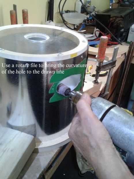 Yo nunca he cortado usando esta técnica, pero yo no soy responsable si haces! Cuando haya terminado, los bordes del agujero será un poco distorsionada. Sostenga un trozo de madera curvada en el interior y aprovechar el exterior del corte con un pequeño martillo aplanar así los defectos contra la madera. Cuando eso se hace, utilizar un tambor lijador en un taladro de mano para suavizar los bordes del agujero y sacar para que coincida con la línea interna.