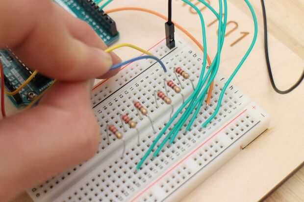 Ahora es el momento para conectar en el LED. Los cables amarillos (GND) van en el bus de tierra en el protoboard, y los cables azules van en la misma fila que su respectiva resistencia.