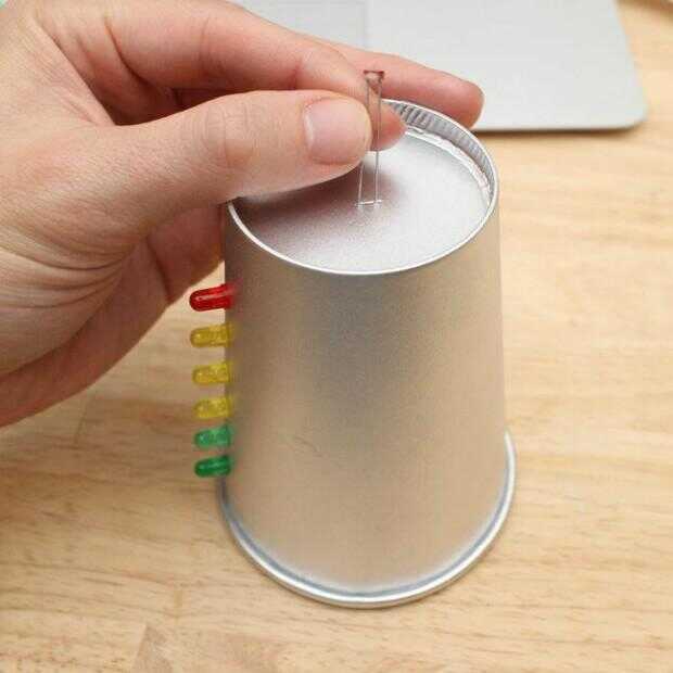El cuerpo principal del theremin es una taza de papel doméstico. Spray pintado plata para darle un ambiente retro-futuro. Luego procedí a cortar 6 rajas, espaciadas 1/2" aparte, con un cuchillo de la manía. Entonces prueba de ajuste de LED.