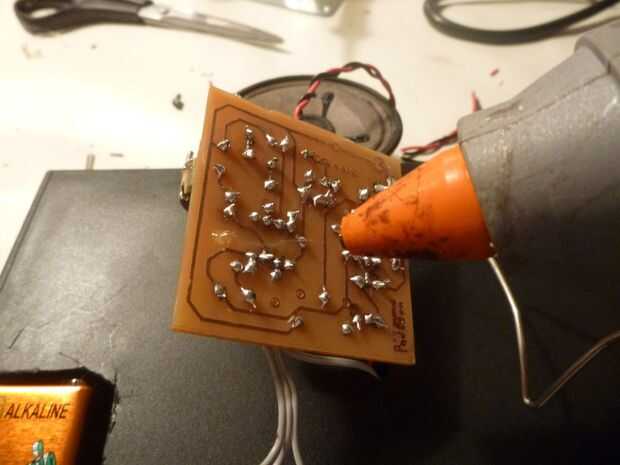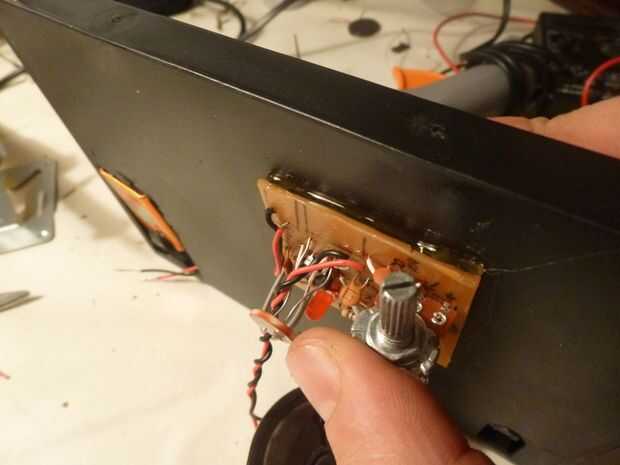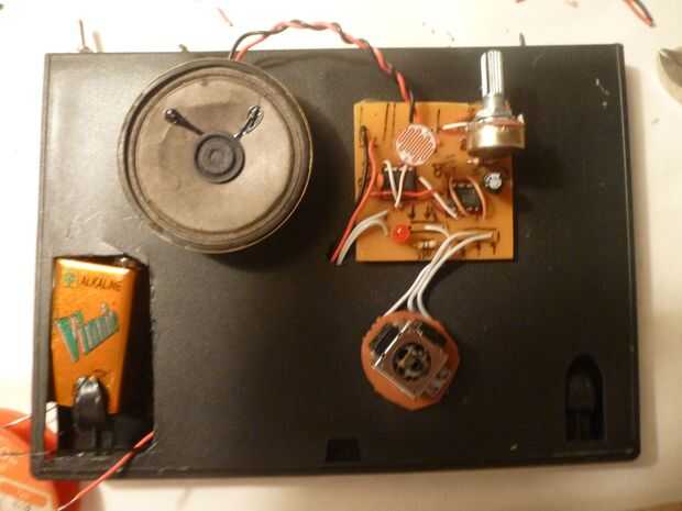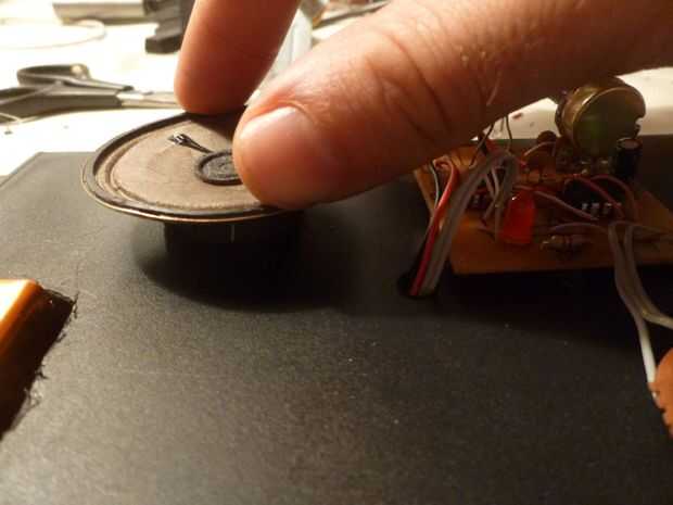 La PCB y el potenciómetro de la palanca de mando se pegan al caso así, y poner el altavoz en uno de los rincones. Asegúrese de que el peso está equilibrado en el caso para no inclinar cuando lo coloque en la nevera.