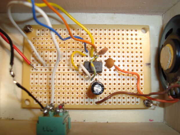 Simplemente tomar el circuito completo y resto de componentes conectado y caer en. Entonces armados con pegamento estupendo, seguro cualquier elementos sueltos. Perforar el agujero de 1/4" en el lado anterior, centro el speker sobre él y pegamento estupendo en el lugar. A continuación monte el circuito terminado en un lugar donde pueden sentarse cómodamente y permitir que la caja abrir y cerrar completamente. Una vez encontrado que punto utiliza algún pegamento o tornillos para fijarla, repita esto para la batería. Cerrar el cuadro y el interruptor...