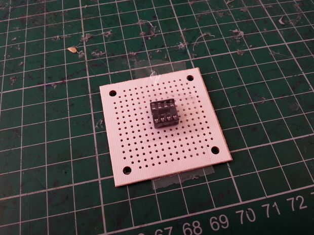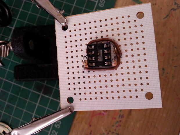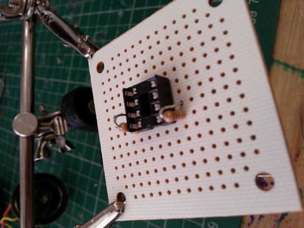 Coloque el soporte de la IC en el centro de la pequeña placa perforada y cinta en para guardarlo de caer cuando usted voltea el tablero. Darle la vuelta y los 8 de los pines de soldadura. Su poco ayudar a hombre de las manos ayudará aquí. Luego, añadir las resistencias. El resistor de 1M debe ir del pin 1 al pin 2 del IC, y el 10k uno va de pin 7 a pin 8. Ahora tenemos que conectar el pin 2 al pin 6 con un cable puente y pin 4 a pin 8. La soldadura en estos.