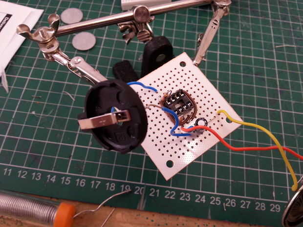 He adjuntado algunos cables a los pines para hacerlo más accesible desde dentro de la gallina. La pata positiva va al pin 8 y la pata negativa va al pin 1.
