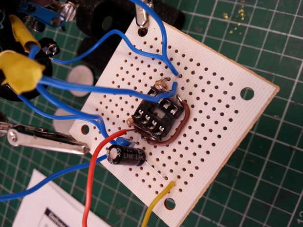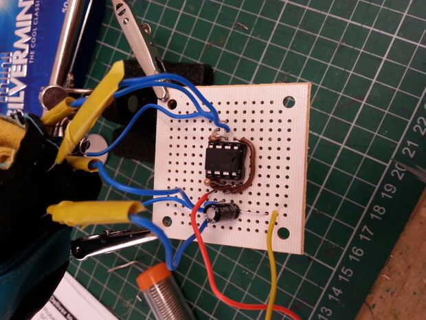 He poked perforaciones en la cara de la gallina y a las dos LDRs de sus ojos. Usted no puede ver muy bien en esta foto pero el pollo está en el extremo de los cables. Así que en este momento, fije las LDRs en el exterior de la cosa. He adjuntado en paralelo, usted podría conéctelos en serie ya sea. Depende del tipo de sonido que desee. Va de una pierna de cada LDR en el pin 3, y las otras piernas ir a pin 6. Distancia de la soldadura. Ahora inserte el temporizador 555 y listo! Aquí tenéis un vídeo para mostrar la clase de sonidos locos que puede hacer que el pollo.