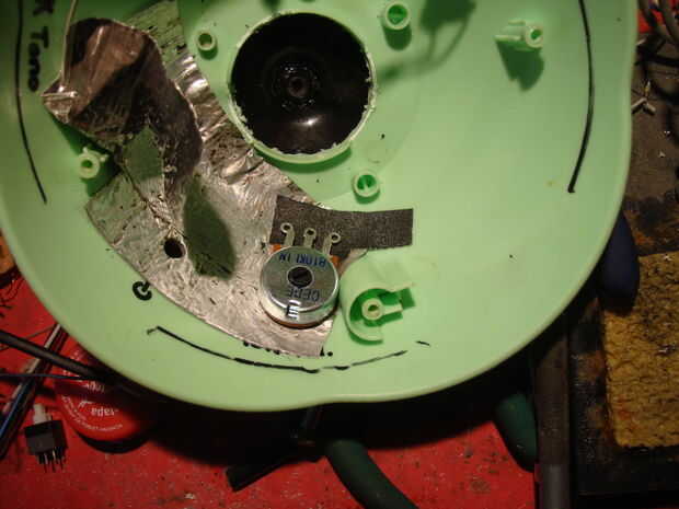 Los agujeros perforados para las macetas (mantener presionado por las tuercas), interruptor y jack audio (mantener presionado por el pegamento).