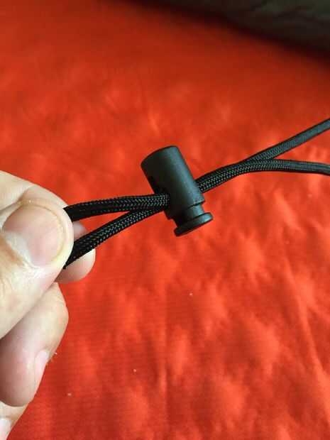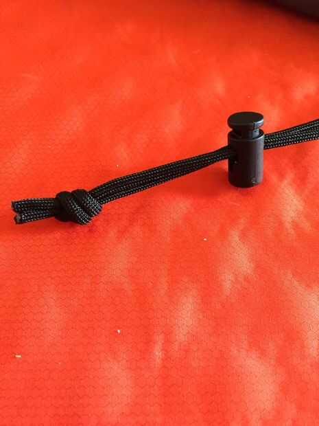 Terminar los extremos, he añadido un pequeño bloqueo de fricción que saqué de un viejo bolso de cadena sorteo a mina para hacer fácilmente ajustable. Para hacer esto, los dos extremos del hilo de rosca y del hilo de rosca a la misma dirección a través del agujero antes de poner un nudo en ella. La cerradura de la fricción no es necesaria; sólo podía atarlo, pero me parece que hace más fácil.