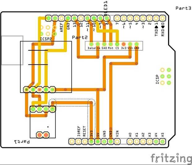 Para obtener una descarga de PCB hecha lista el archivo fritzing ThermoClock.fzz y abrirlo con Fritzing. Desde aquípuedes llegar Fritzing. También puede solicitar a través de la PCB Fritzing si no desea hacerlo.