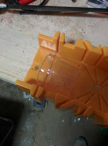 Ahora tenemos la sierra, el calibre de ingletes y el tubo de acrílico. Simplemente córtela en pequeños trozos que decidí hacer la caja (tubo) de 40mm de largo (Foto 2). Ahora coge la sierra otra vez y hacer un poco de la barbilla en un lado del tubo, hacerlo suave con la Lima de metal. That´s donde los cables va a salir ;-) (ver imagen 3)