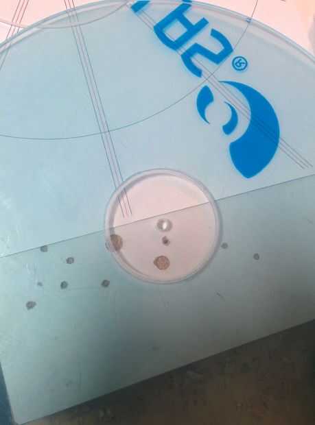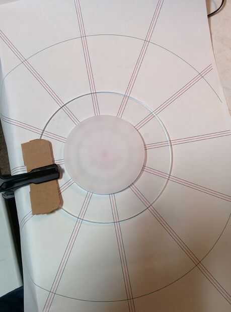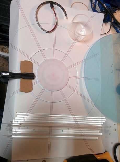 Tomar la placa de tierra y alinear en el plan, para que pueda obtener el centro del círculo. Ahora toma el taladro de mano con el poder taladro montado sobre él y perfore (muy lento! no a mucha presión!) un agujero en el centro de la placa de tierra, el círculo externo debe ser ~ 2-3mm profundo. Esto es para hundir la tira de LED en la placa de la tierra (~ 10mm de ancho de la tira de LED, vigas sólo 5mm de diámetro) y alinearlos con las vigas (véase cuadro 1).