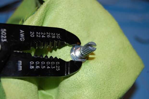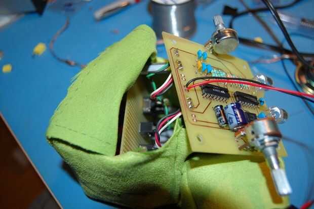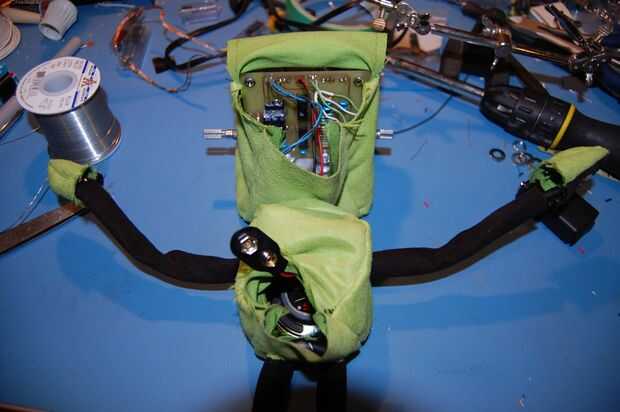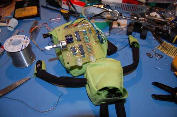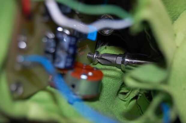 Vuelva a alinear la placa de circuito con el perfboard, primero los ejes del potenciómetro de la alimentación a través de los orificios a ambos lados de la cabeza del robot. Luego apriete los tornillos que sujetan la placa de circuito para el perfboard y apriete las tuercas de los potenciómetros. Los dos tornillos más cercanos a la cara del robot son difíciles de acceso, alimenta un destornillador a través del cuerpo del robot y el siguiente para llegar a ellos. No te preocupes, fue fuertemente sedado y no sentir nada.