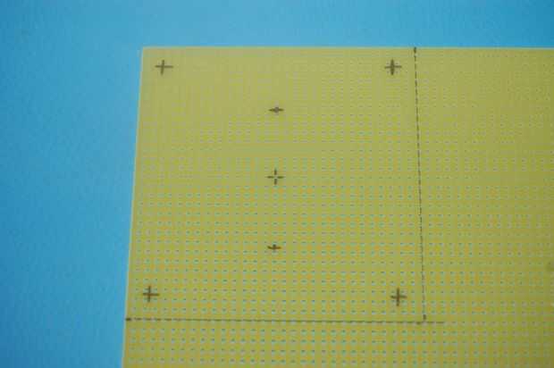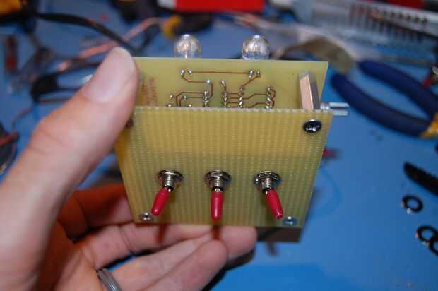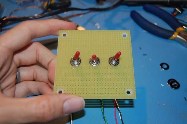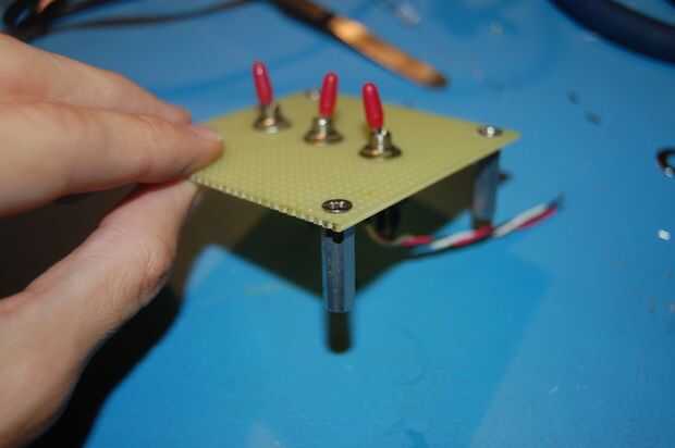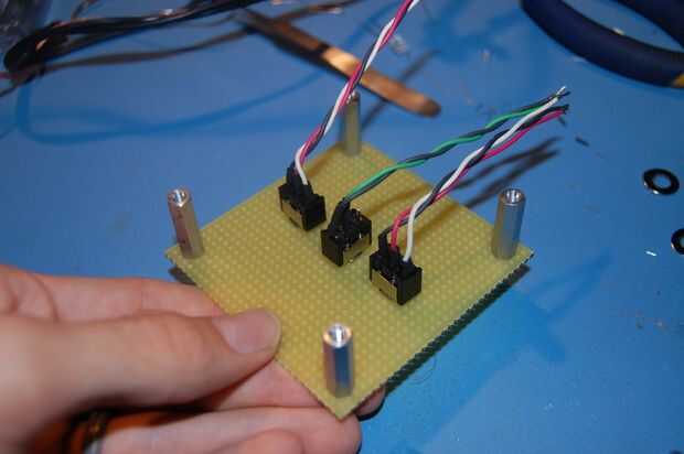 Cortar un trozo de perfboard igual al tamaño del PCB (3 x 3 pulgadas). Taladre orificios en las cuatro esquinas que coincidan con los agujeros de la PCB. Perfore tres agujeros más que coincidir con el diámetro del eje de los interruptores. Puedes poner estos tres agujeros dondequiera usted tiene gusto; He decidido ponerlos en línea. Montar los interruptores en el perfboard, utilizando una de las tuercas. Guardar la segunda tuerca para más adelante.