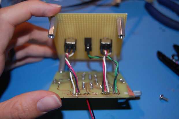 Con los interruptores instalados, puede enlazar el perfboard al PCB usando los separadores. El perfboard debe montarse tal como se muestra en la imagen. He usado cabeza plana tornillos en el lado de perfboard, para que las cabezas de los tornillos no causan la tela protruya. No apriete los tornillos completamente todavía, como usted necesitará quitar el PCB de perfboard para montaje dentro de la cabeza del robot más tarde.