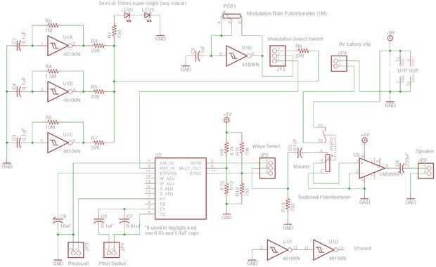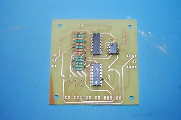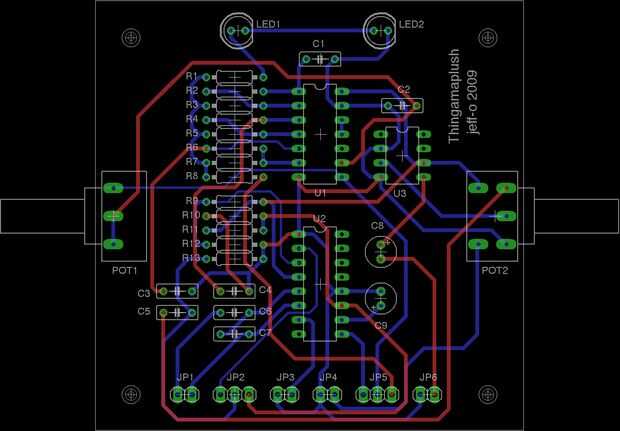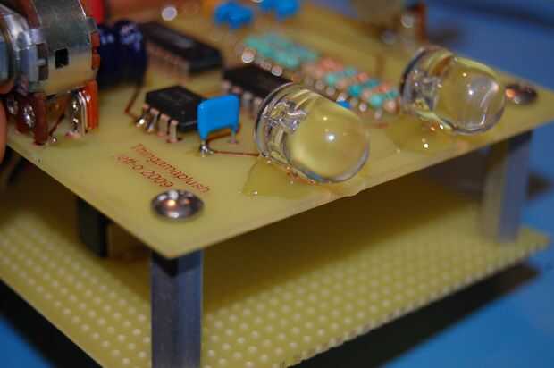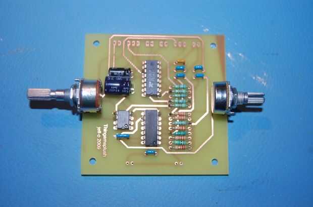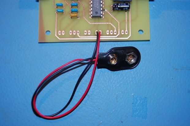 Ahora, rellenar la junta con el diseño de junta y lista de piezas como guía. Comience con el ICs y luego las resistencias y las tapas. Asegúrese de que los dos condensadores electrolíticos están instalados con la polaridad correcta. Al soldar los LEDs, doble las puntas un poco para que el LED quede al ras con el borde de la tabla. LEDs están polarizados también, instalar la manera correcta! Por último, soldar en los potenciómetros y el clip de la batería de 9V.