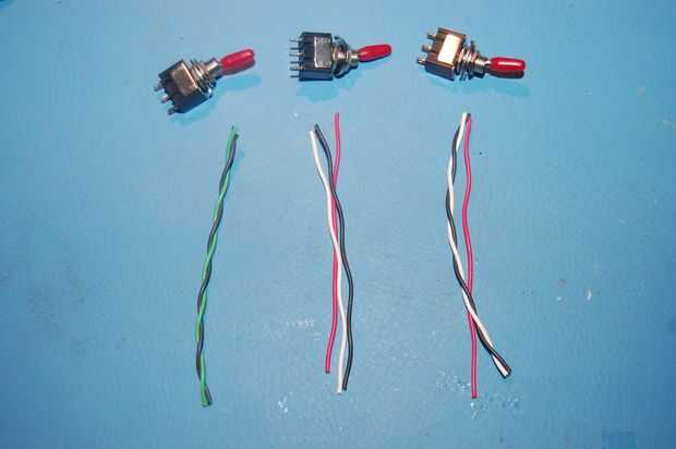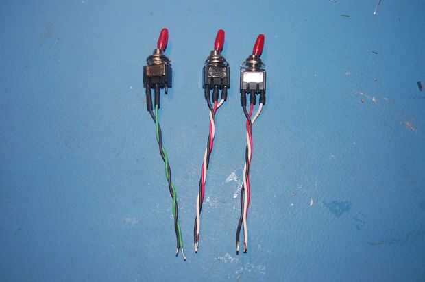 Dos de los interruptores tienen tres cables, uno de ellos necesita solamente dos. Soldadura sobre 2-3" de cables en las clavijas de los interruptores y acabado con calor encogen. Observe que el cuerpo del interruptor no debe ser más de los separadores, o no se ajustan.
