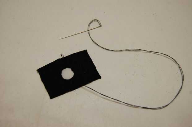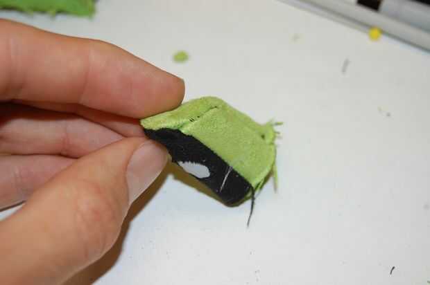 Empezar por coser el parche de nylon blanco sobre la "Palma" de la mano. Utilice la misma puntada de apliques como en la cara. Puede que necesite hacer esto a mano.