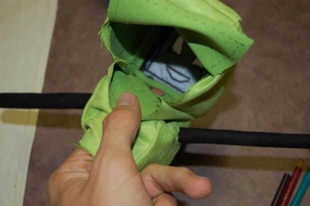 Ahora puede conectar los brazos y las piernas. Esto se hace a mano utilizando un Sobrecosa o una puntada simple. Realmente, todo lo que tiene el apéndice en su lugar y se ve razonablemente limpio va a hacer. Pasar el accesorio a través del cuerpo todavía invertido y a través del orificio correspondiente. Puedes hacer "fichas" en el extremo del brazo que está siendo cosido al cuerpo, para facilitar las cosas. Coser cuidadosamente todo el perímetro, no dejando espacios. Puede ayudar a dejar un pedazo de la envoltura de alambre o tubo en el brazo, para que accidentalmente no coser la abertura cerrada.