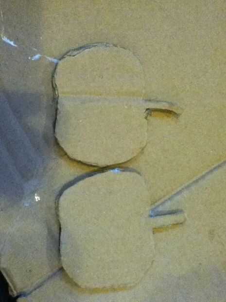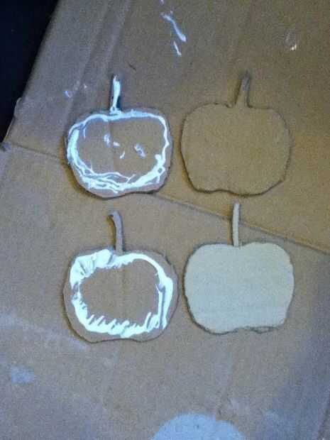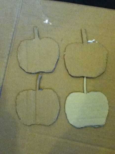 Primero cortamos la cartulina en cuatro manzanas. Y luego tomamos dos manzanas para encolarla together.we izquierdo dos manzanas y hacemos lo mismo como último one.we cortar el cartón en ocho manos de apple. A continuación tomamos dos manos y pégala junto (hacer lo mismo para tres más.)