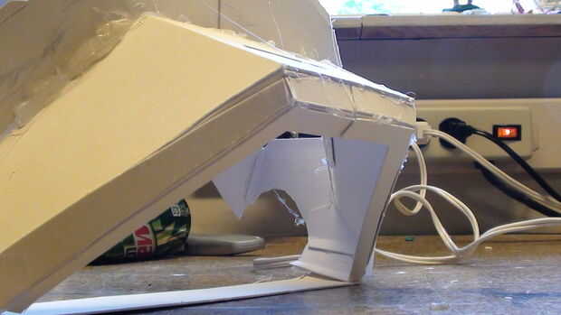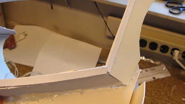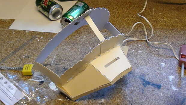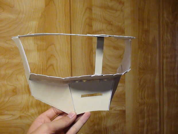 Ahora que tienes la forma de él, necesita agregar la guarnición alrededor de donde estará el plástico. Justo lo mismo que el resto del pepakura excepto que vas a tener que hacer su propia pieza. Debe ser alrededor de la anchura de las aletas del doblez y tan largo como la longitud de los bordes de la pieza ocular. Tenemos que añadir varias piezas de ajuste para algunas áreas para que la pieza de plástico de ajuste más verticalmente, por lo que quizás tenga que ajustar el suyo si su parte inferior de la pantalla era más en que la parte superior como el nuestro era. Esto sólo significa que el plástico se va inclinado ligeramente hacia fuera en la pieza acabada. Puede sonar mal, pero todavía parece realmente bueno, así que no preocuparse.