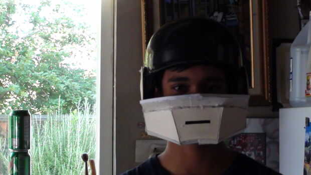 Ahora, fije la parte inferior de la cara en el casco con una tonelada de mierda de pegamento caliente. Uso el pepakura para una referencia para la posición de la cara en el casco. Utilice las abrazaderas tipo c Si desea mantener la pantalla en su lugar hasta que el pegamento esté completamente seco. Esta parte tendrá algunos problemas si no haces algo correcto. Tenemos que doblar nuestros bastante lejos para que se ajuste, por lo que tendrás que ver lo que tienes que hacer para que funcione.