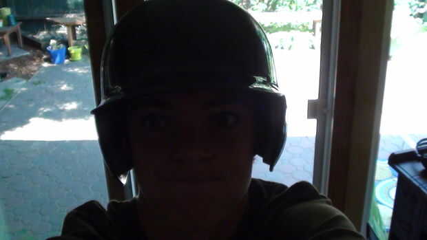 Perdón por las fotos, yo no soy un profesional, como se puede saber. De todos modos, usted puede ver que en esta foto, los oídos protruyan un poquito, que demostró para ser un problema con este casco. Si usted puede encontrar un casco con menos bombeo, sería mejor. Como veis en las fotografías posteriores, hay no hay orificios de ventilación o cualquier cosa en este casco que no sea un agujero en la parte superior, que se fija fácilmente con fibra de vidrio.