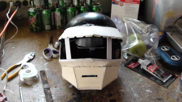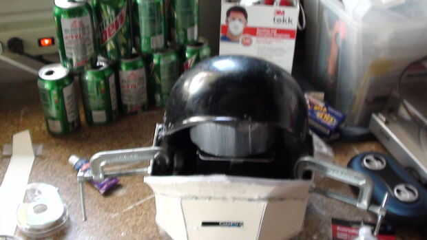 Como se puede ver en estas fotos, le cortamos la visera en el casco de béisbol. Para obtener el ángulo derecho de la visera, que tendrás que cortar esta parte, que es fácil si tienes una herramienta dremel. Si no, bueno... ser creativos. Una vez allí, el pegamento en la parte superior de la visera con el ángulo deseado. Otra vez, no se superponen el cartón, porque terminarás con una protuberancia en la parte superior que no se ve bien.