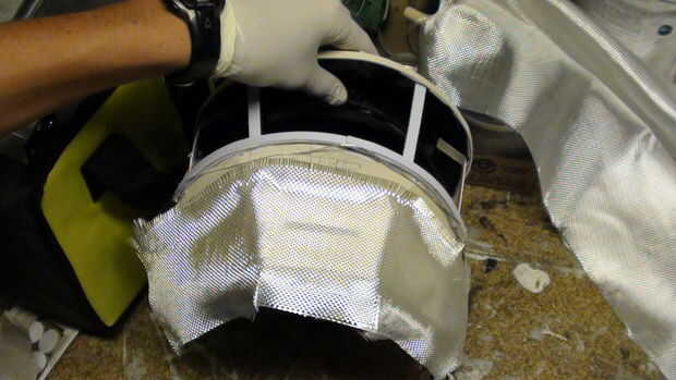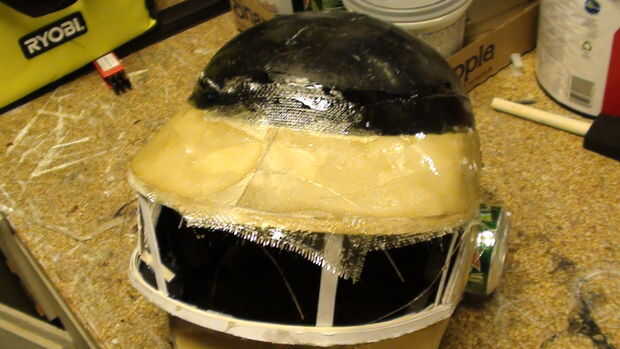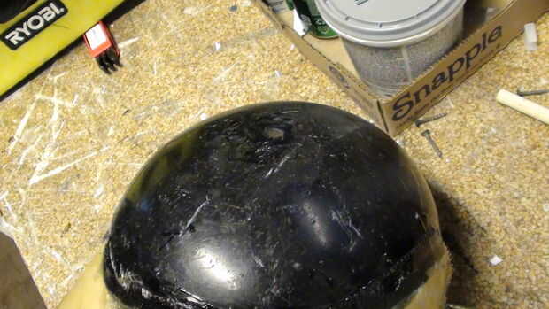 Aquí está una foto (#2) de la misma cuando ha mojado con resina, observe las burbujas de aire en la parte superior derecha, en el área de la barbilla. CONSEGUIRLOS HACIA FUERA. Trabajo duro en esta sección, usted quiere que sea lo mejor posible como cemento la forma de su casco.