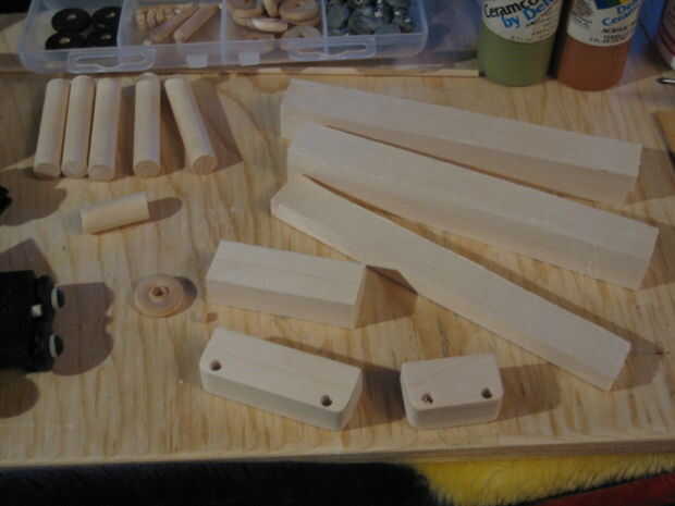 Que barniz todo y darle un lijado suave con papel antes de pintar las cabezas de eje, ruedas y negro chasis, asegurándose de mantener el agujero de la rueda y el eje de árbol desnudo ya que la madera sin pintar y sin barniz es bastante sin fricción. Después una capa de barniz luego aplique una pequeña cantidad de pegamento en el interior de los agujeros en el chasis y montar las ruedas con los pasadores del eje, utilizando la pista de prueba para asegurarse de que los tengo separados uniformemente.